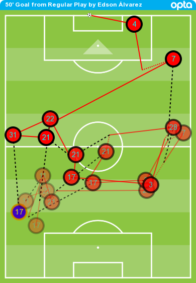 지난 릴전(3:0 승)에서 MF 알바레스의 추가골이 나오는 과정입니다. 좌측 후방에서 언제나 빌드-업의 시발점이 되는 블린트의 발에서 시작된 패스는 좌측에서 우측으로 다시 좌중앙으로 이동하면서 수비를 끌어들입니다. 그러면서 자연스레 우측에서 공간이 생긴 네레스에게 길게 연결한 후 1:1 페넌트레이션을 주문, 득점 찬스를 만들어냅니다.