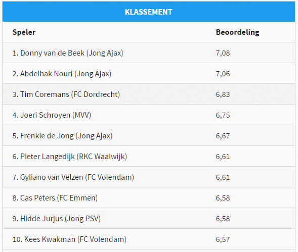 + 유필러리그(2부) 제1 피리어드 평점 순위입니다. 아약스 유망주들이 상위권을 점거하고 있다는 점, 제1 피리어드 챔피언 용 PSV(리저브) 소속은 GK 하이데 유리우스뿐이라는 게 이채롭네요. (2016년 10월 13일)