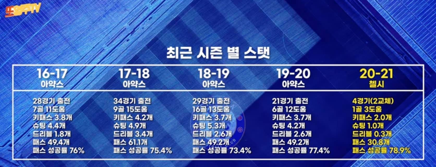 전술적 주문이 있었을 수도 있겠고 본인의 경기 외적인 문제일 수도 있다. 반면 첼시에서의 경기들을 돌아보면 부상의 여파라고 보기는 어렵다. 심리적으로 위축이 됐을 만한 문제가 생겼을 수도 있고 환경의 문제가 그의 컨디션에 영향을 주고 있을 수도 있다. 이 모든 게 궁예지만 결론은 경기 외적인 이슈에 부딪혀 본연의 색을 완전히 잃어버렸다고 볼 수밖에 없다. 거듭 이야기하지만 리그 레벨의 문제를 벗어난 수준이고 이러한 주장에 동의하지 않는 분들은 적어도 아약스 시절 지예흐가 UCL에서 활약하던 경기들을 복기해보시라고 권유하고 싶다.