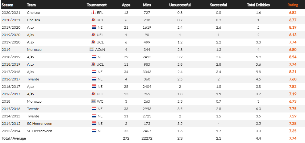 올 시즌 지예흐가 이상하게, 어색하게 보이는 건 이 스탯이 말해준다. 아약스 시절 기록과 가장 큰 차이는 드리블 성공/시도 횟수. 물론, 초반 기록이긴 하지만 부상으로 빠진 기간도 많고 큰 차이는 없을 거다. 단도직입적으로 말해서 시도 자체가 너무 적다. 아래 표를 보면 알겠지만 경기당 평균 드리블 시도가 최소 3회, 최대 6회까지 가던 선수가 첼시에서는 1.6회에 그치고 있다.