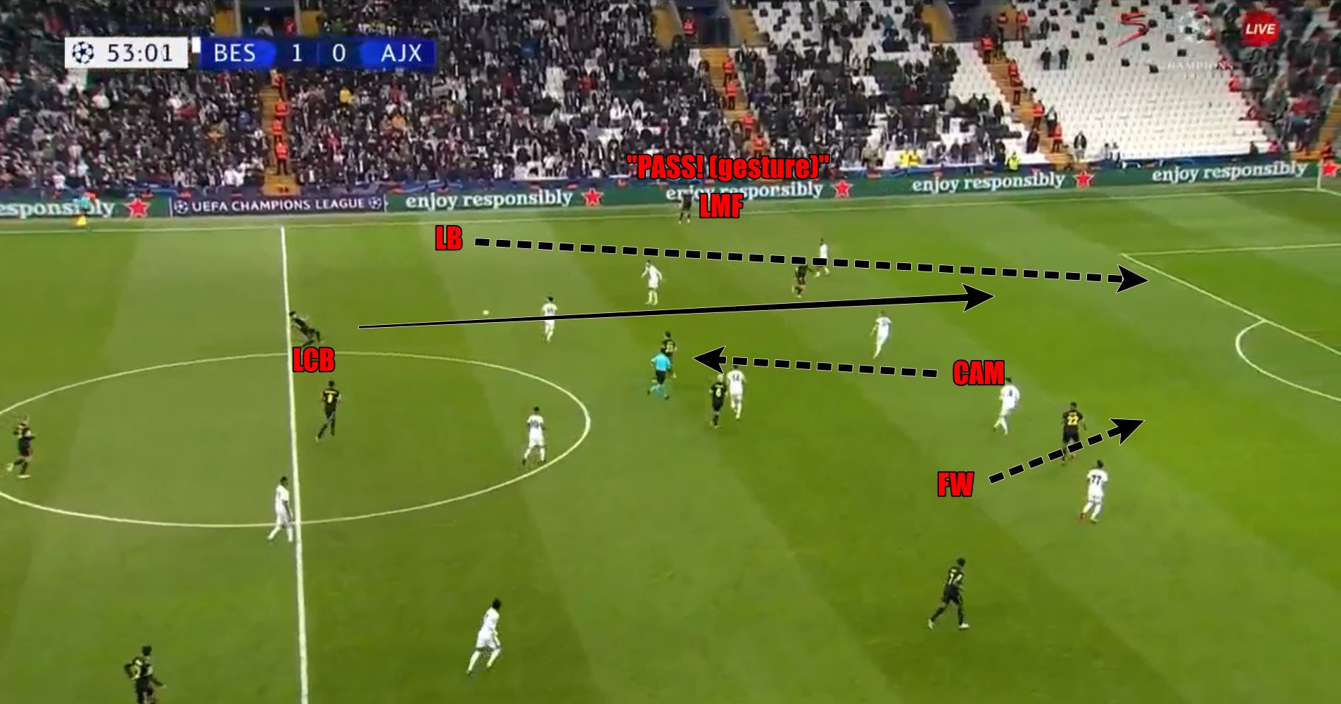 - CAM(베르하이스)은 상대팀 중앙 수비 사이에 위치해 있다가 볼을 받으려 내려오는 척하면서 수비수의 시선을 분산시킨다