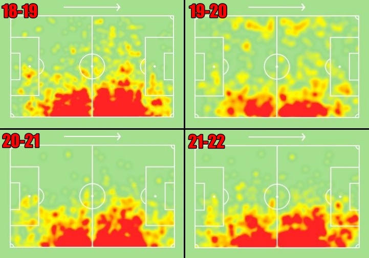 - 21-22시즌에 역대급 퍼포먼스를 보여주는 중. 측면 수비로 올해의 선수에 선정된 막스웰(03-04),블린트(13-14)에 버금가는 퍼포먼스. 공격 국면에서 높은 완성도를 바탕으로 영향력을 발휘 중이고, 수비 국면에서도 팀 체계에 잘 녹아드는 안정감을 보여주고 있다. 그의 유무에 따라 측면의 퀄리티가 달라지고 2선의 경기력에도 영향을 주는 수준.