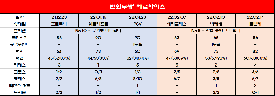 그런데 베르하이스의 빠른 적응이 팀을 바꿨다. S.데용-클라센-반데벡(+다시 클라센)으로 이어지는 ‘아약스형 No.10’을 재해석하면서 공격 패턴 다양화를 만들어냈고 공격 전환 과정에서 빠른 판단력과 자신의 주력을 십분 활용해 속도를 더했다. 이에 아약스 & 네덜란드 레전드 스네이더는 ‘베르하이스는 마치 헬리콥터 같다’면서 칭찬을 아끼지 않았다.